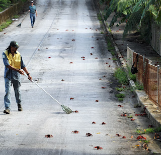 Volunteers sweep migrating red crabs off a road on Christmas Island. The migrating crabs face numerous hazards, such as traffic and predators, on their journeys, and many do not reach their destination.